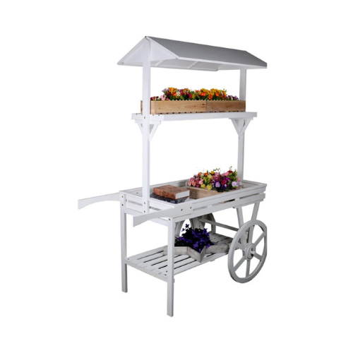Featuring a classic rolling cart design with a canopy top, tiered display shelves, and functional wheels, this flower cart creates instant dimension and visual interest. The multi-level layout makes it ideal for showcasing florals, props, signage, giveaways, or curated styling elements that elevate your overall theme. Whether you’re going for rustic, farmhouse, garden chic, vintage market, or whimsical fair aesthetics, this cart fits right in.